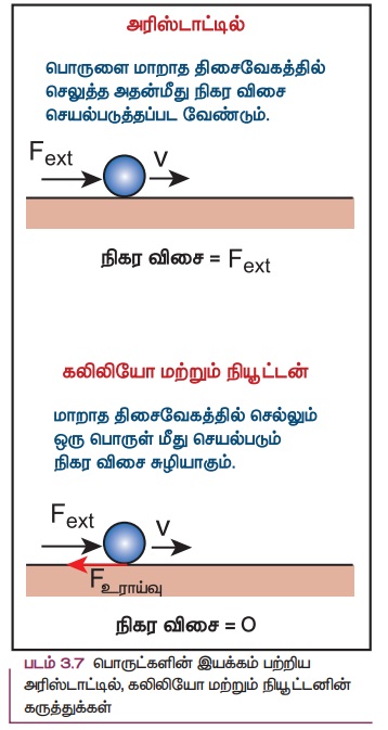 பிரிவு 3.1 இல் விவாதிக்கப்பட்ட சாய்தளம் மற்றும் பந்து சோதனைக்கான சரியான விளக்கத்தினை நியூட்டனின் இரண்டாம் விதி வழங்குகிறது. அந்த சோதனையில் உராய்வினைக் கணக்கில் எடுத்துக்கொள்ளும்போது பந்து சாய்தளத்தின் அடிப்பரப்பை அடைந்தவுடன் (படம் 3.1) சிறிது தூரம் உருண்டு பின்பு ஓய்வு நிலையை அடைகிறது. இதற்குக் காரணம் பந்தின் திசைவேத்திற்கு எதிரான திசையில் ஒரு உராய்வு விசை செயல்பட்டு பந்தினை ஓய்வு நிலைக்குக் கொண்டுவருகிறது. இவ்வுராய்வு விசைதான் திசைவேகத்தைப் படிப்படியாகக் குறைத்து அதனை சுழியாக்கி பொருளின் இயக்கத்தை நிறுத்துகிறது. ஆனால் அரிஸ்டாட்டிலின் கருத்துப்படி, பொருள் சாய்தளத்தின் அடிப்பரப்பை அடைந்த உடன் சிறிது தூரம் உருண்டு சென்று பின்னர் ஓய்வு நிலைக்கு வரும். ஏனெனில் அப்பொருளின் மீது எவ்விதமான விசையும் செயல்படவில்லை.