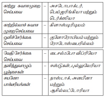 ஆந்தோசெராஸ், அசோலா மற்றும் சைக்கஸ் பவளவேர் ஆகியவற்றில் காணப்படும் சயனோ பாக்டீரியங்கள் மூலமும் நைட்ரஜன் நிலைநிறுத்தம்