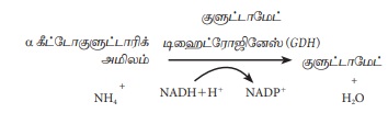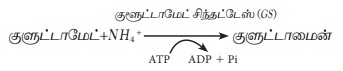 அம்மோனியாவானது α- கீட்டோகுளுட்டாரிக் அமிலத்துடன் வினை புரிந்து குளுடாமிக் அமிலம் (குளுடாமேட்) உருவாக்கும் வினை.