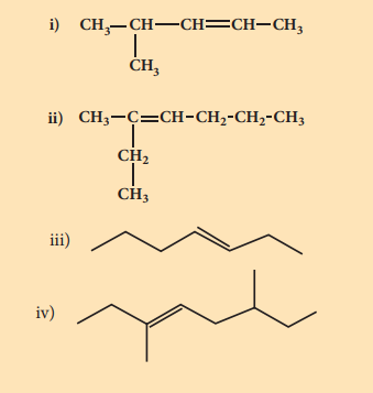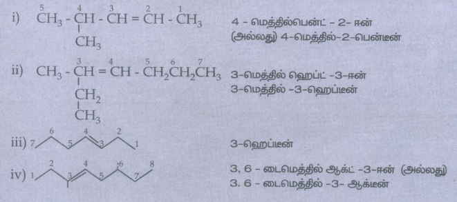 அலகு 11-ல் கற்ற IUPAC பெயரிடும் முறைக்கான பொதுவான விதிகளை பயன்படுத்தி கீழ்கண்ட ஆல்கீன்களுக்கு IUPAC பெயர்களை எழுதலாம்.