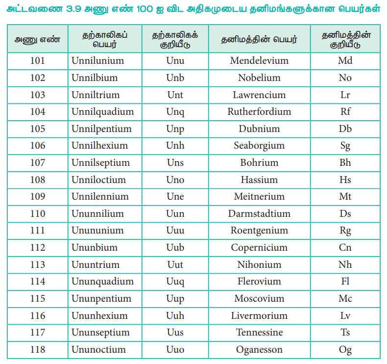 அட்டவணை 3.9 அணு எண் 100 ஐ விட அதிகமுடைய தனிமங்களுக்கான பெயர்கள்