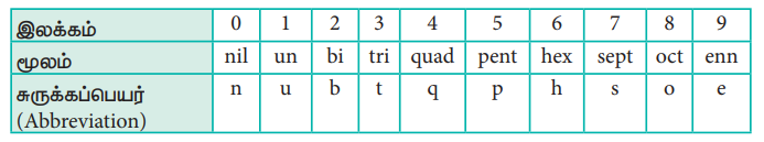 அட்டவணை - 3.8: அணு எண் 100 ஐ விட அதிகம் பெற்றுள்ள தனிமங்களுக்கு IUPAC முறையில் பெயரிடுதலுக்கான குறியீடு