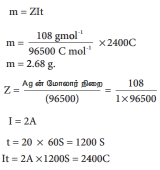 ஃ எனவே 2 மோல் ஹைட்ரஜன் வாயு 4 மோல். அதாவது 4F மின்சுமையை உருவாக்கும். Q = It என நாம் அறிவோம்