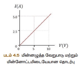 வெப்பநிலையில் மின்தடை ஒரு மாறிலி ஆகும். மின்னழுத்த வேறுபாடு V யும் மின்னோட்டம் I யும் ஒன்றுக்கொன்று நேர்தகவில்