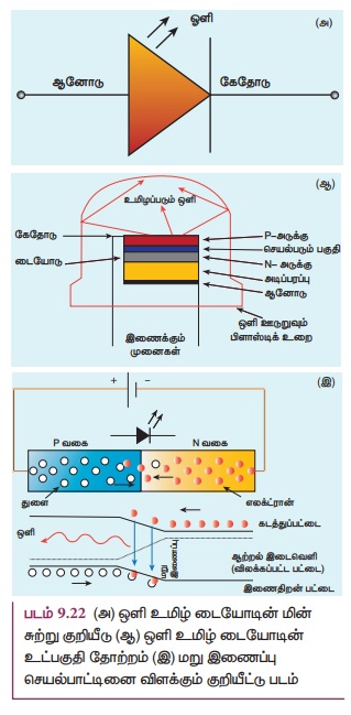 LED இன் மின்சுற்றுக் குறியீடு படம் 9.22 (அ) இல் காட்டப்பட்டுள்ளது.