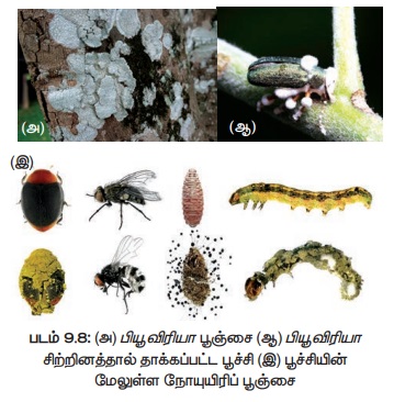 பியூவிரியா சிற்றினம் என்பது உலகெங்கிலும் மண்ணில் இயற்கையாக வாழக்கூடிய ஒரு பூச்சி நோயுயிரி (entomo-pathogenic) பூஞ்சையாகும். இவை பல்வேறு கணுக்காலி சிற்றினங்களில் ஒட்டுண்ணியாக வாழ்ந்து வெள்ளை மஸ்கர்டைன் நோயைத் தாவரத்தின் வளர்ச்சியைப் பாதிக்காதவாறு ஏற்படுத்துகின்றன. இது ரைசாக்டோனியா சொலானி என்ற பூஞ்சையால் தக்காளியில் ஏற்படுத்தப்படும் நாற்றுமடிதல் நோயைக் கட்டுப்படுத்துகிறது.