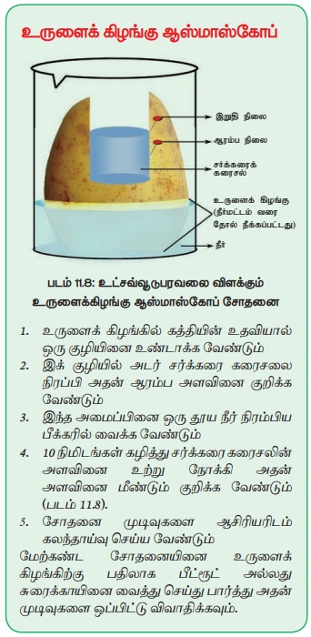 5. சோதனை முடிவுகளை ஆசிரியரிடம் கலந்தாய்வு செய்ய வேண்டும் மேற்கண்ட சோதனையினை உருளைக் கிழங்கிற்கு பதிலாக பீட்ரூட் அல்லது சுரைக்காயினை வைத்து செய்து பார்த்து அதன் முடிவுகளை ஒப்பிட்டு விவாதிக்கவும்.