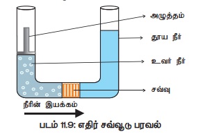 எதிர் சவ்வூடு பரவலின் செயல்முறை சவ்வூடு பரவலைப் போன்றதே ஆனால் இது எதிர் திசையில் நடைபெறும். இதன்படி கரைசலில் ஓர் அழுத்தத்தினை ஏற்படுத்துவதன் மூலமாக நீரானது எதிர் திசையில் செறிவு சரிவு வாட்டத்திற்கு எதிராக செல்கிறது. வழக்கமான சவ்வூடுபரவலில், நீரானது அதிக அடர்வுள்ள இடத்திலிருந்து (தூய நீர் - ஹைப்போடானிக்) குறைவான அடர்வுள்ள இடத்திற்கு (உப்பு நீர் - ஹைப்பர்டானிக்) செல்லும். ஆனால் பின்னோக்கிய சவ்வூடு பரவலில் நீர் மூலக்கூறுகள் குறைவான அடர்வுள்ள இடத்திலிருந்து (உப்பு நீர் ஹைப்பர்டானிக்) அதிக அடர்வுள்ள இடத்திலிருந்து (தூய நீர் - ஹைப்போடானிக்) தேர்வு கடத்து சவ்வின் வழியாக செல்லும் (படம் 11.9).
