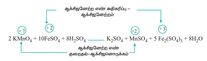 இவ்வினையில், பொட்டாசியம் பெர்மாங்கனேட்டில் (KMnO4) உள்ள மாங்கனீஸ் (Mn), பெர்ரஸ் சல்பேட்டை, (FeSO4) பெர்ரிக் சல்பேட்டாக (Fe2(SO4)3) ஆக்சிஜனேற்றம் அடையச் செய்வதற்கு காரணமாக அமைகிறது. இவ்வினையில் மாங்கனீஸ் ஐந்து எலக்ட்ரான்களை ஏற்றுக் கொண்டு ஒடுக்கமடைகிறது. இத்தகைய வினைப்பொருட்கள் ஆக்சிஜனேற்றிகள் என அழைக்கப்படுகின்றன. இதைப்போலவே, எலக்ட்ரான்களை இழந்து ஆக்சிஜன் ஒடுக்கத்திற்கு துணை புரியும் வினைப்பொருட்கள் ஆக்சிஜன் ஓடுக்கிகள் என அழைக்கப்படுகின்றன.