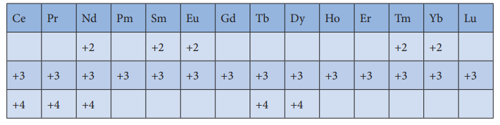 வெவ்வேறு ஆக்சிஜனேற்ற நிலைகளின் நிலைப்புத் தன்மையானது இத்தனிமங்களின் பண்புகளைத் தீர்மானிக்கிறது. லாந்தனாய்டுகளின் பல்வேறு ஆக்சிஜனேற்ற நிலைகள் பின்வரும் அட்டவணையில் கொடுக்கப்பட்டுள்ளன.