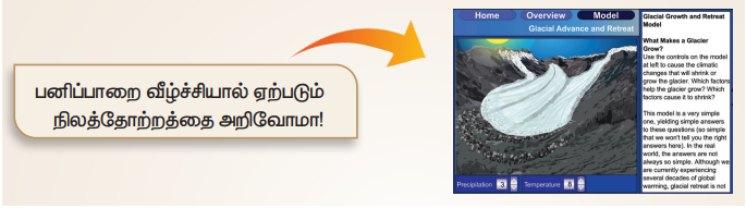 'Glacier type' தெரிவு செய்து அம்பு குறியீட்டின் மூலம் மாற்றி பனிப்பாறை ஏற்படுத்தும் நில தோற்றங்களை அறியவும்
