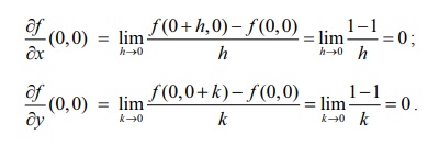 (ii) இதனை நிறுவ y = x என்ற நேர்கோட்டுப் பாதையில் (x,y) → (0,0) எனும்போது f –ன்எல்லைமதிப்பை கணக்கிடுவோம். lim f (x,y) = 0; ஏனெனில் y = x என்ற நேர்கோட்டுப் பாதையில் x ≠ 0 எனில் f (x,y) = 0. ஆனால் f (0, 0) =1 ≠ 0; எனவே (0,0) இல் f தொடர்ச்சியற்றது.