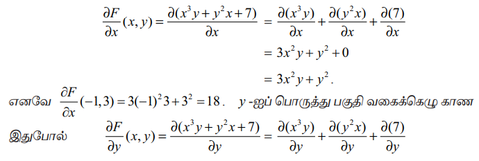 அனைத்து (x, y) ∈ ℝ2 -க்கும் F(x, y) = x3 y + y2 x+7 எனில்∂F/∂x (-1,3) மற்றும் ∂F/∂y (-2,1) ஆகியவற்றைக் காண்க.