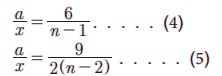 எனவே, n = 5 ஆகும். n = 5 ஐ (1) மற்றும் (4) இல் பிரதியிட்டு, சமன்பாடு (1) ஐ சமன்பாடு (4) ஆல் வகுக்க,