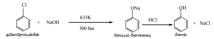 300 வளிமண்டல அழுத்தம் மற்றும் 633K வெப்பநிலை கொண்ட மூடிய கலனில் வைத்து குளோரோ பென்சீனை 6-8% NaOH கொண்டு நீராற்பகுக்கும் போது முதலில் சோடியம் பீனாக்ஸைடு கிடைக்கிறது. இதனை நீர்த்த HC) கொண்டு வினைப்படுத்த பீனால் கிடைக்கிறது.