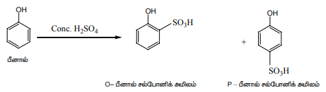 280K வெப்பநிலையில் பீனால் அடர் அடர் H2SO4உடன் வினைப்பட்டு O– பீனால் சல்போனிக் அமிலம் முக்கிய விளைபொருளாக கிடைக்கிறது. மாறாக 373K வெப்பநிலையில் p - பீனால் சல்போனிக் அமிலம் முக்கிய விளை பொருளாக கிடைக்கிறது.