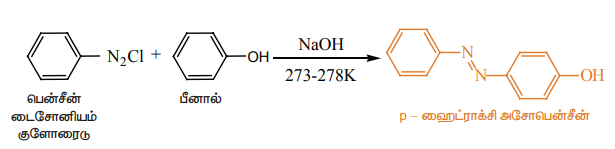 காரம் கலந்த பென்சீன் டயசோனியம் குளோரைடுடன் பீனால் இணைந்து p-ஹைட்ராக்ஸி அசோபென்சீன் (ஆரஞ்சு சிவப்புநிற சாயம்) கிடைக்கிறது.