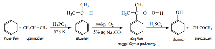 523K வெப்பநிலையில் H3PO4 வினையூக்கி முன்னிலையில் ஒரு மூடிய கலனில் பென்சீன் மற்றும் புரோப்பீன் கலந்த கலவையை வெப்பப்படுத்தும் போது கியூமின் (ஐசோரோப்பைல் பென்சீன்) கிடைக்கிறது. கியூமின் மற்றும் 5% நீரிய சோடியம் கார்பனேட் கரைசலுடன் காற்றை செலுத்தும் போது ஆக்ஸிஜனேற்றமடைந்து கியூமின் ஹைட்ரோபெராக்ஸைடு கிடைகிறது. இதனை நீத்த அமிலத்துடன் வினைப்படுத்தும் போது பீனால் மற்றும் அசிட்டோன் கிடைக்கிறது. அசிட்டோன் இவ்வினையில் முக்கிய துணை விளைபொருளாக கிடைக்கிறது.