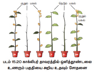 இதில் ஒரு இலையை குறும் பகல் சூழலிலும் மற்ற இலைகளை நெடும் பகல் சூழலிலும் வைத்தால்