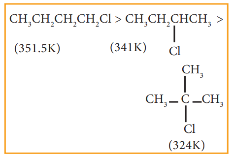 iii) ஹேலஜன் அணுக்களின் எண்ணிக்கை அதிகரிப்பின் ஹேலோ ஆல்கேன்களின் கொதிநிலையும் அதிகரிக்கும்.