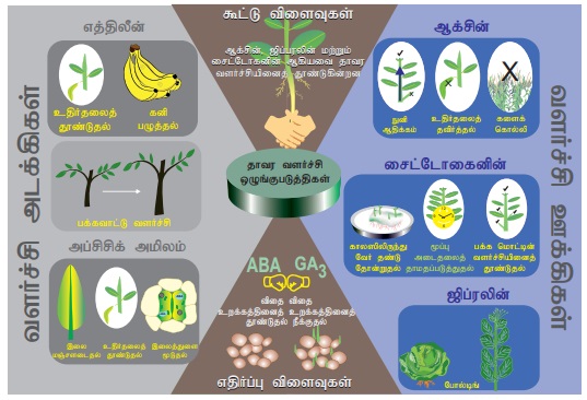 ii. எதிர்ப்பு விளைவுகள் (Antagonistic effects): இதில் பங்கு பெறும் இரண்டு கரிமச் சேர்மங்கள் தாவரத்தின் குறிப்பிட்ட பணி மேற்கொள்வதில் மாறுபட்ட விளைவுகளை ஏற்படுத்துகிறது. ஒன்று குறிப்பிட்ட பணியை ஊக்குவிக்கும், மற்றொன்று அப்பணியைத் தடை செய்கிறது. ABA மொட்டு மற்றும் விதை உறக்கத்தைத் தூண்டுகிறது, ஜிப்ரலின்கள் அதைத் தடை செய்கிறது.