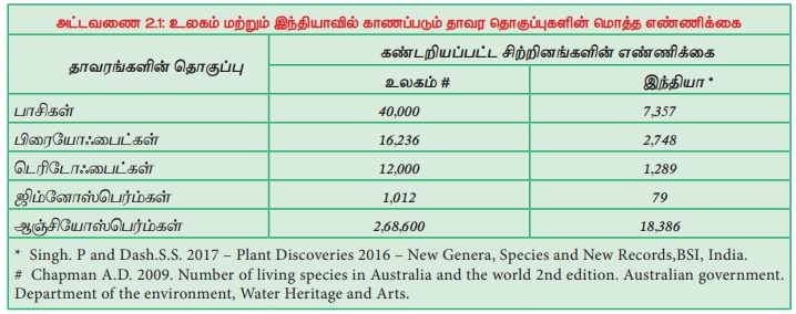 பொதுவாக புவியில் காணப்படும் உயிரினங்களை அவைகளின் ஊட்டமுறை, நகரும் தன்மை மற்றும் செல்சுவர் உடைய அல்லது செல்சுவர் அற்ற பண்புகளின் அடிப்படையில் தாவரங்கள், விலங்குகள் என பிரிக்கப்பட்டன. தாவரக் குழுவில் பாக்டீரியங்கள், பூஞ்சைகள், பாசிகள், பிரையோஃபைட்கள், டெரிடோஃபைட்கள், ஜிம்னோஸ்பெர்ம்கள், ஆஞ்சியோஸ்பெர்ம்கள் போன்றவை இடம்பெற்றுள்ளன. அண்மையில் மூலக்கூறு பண்புகளின் அடிப்படையில் பாக்டீரியங்கள் மற்றும் பூஞ்சைகள் பிரிக்கப்பட்டு தனிப்பெரும் பிரிவுகளில் வகைப்படுத்தப்பட்டுள்ளன. தாவரவியல், உலகின் மிகப்பழமை வாய்ந்த ஒரு அறிவியல் பிரிவாகும். ஏனென்றால், ஆதி மனிதர்கள் தங்கள் தேவைகளை ஈடுசெய்வதற்கும், உணவு, உடை, மருந்து, தங்குமிடம் போன்றவைகளுக்கு தேவையான தாவரங்களைக் கண்டறிந்து பயன்படுத்தி வந்தனர். தாவரங்கள் தனித்தன்மை பெற்ற உயிரினங்கள் ஆகும். இவைகள் மட்டுமே சூரியனிலிருந்து பெறப்படும் ஒளியாற்றலை வேதிய ஆற்றலாக மாற்றி, ஒளிச்சேர்க்கை எனும் வியப்பான வினையை நடைபெறச் செய்து, உணவை தயாரித்துக் கொள்கின்றன. புவியில் உள்ள அனைத்து உயிரினங்களுக்கும் ஊட்டம் வழங்குதல் தவிர உலக வெப்பமயமாதலுக்கு காரணமான கார்பன் டை ஆக்சைடு எனும் வளியை பிரித்தெடுத்து ஒளிச்சேர்க்கைக்குப் பயன்படுத்தி தீயவிளைவிலிருந்து புவியைப் பாதுகாக்கின்றன. தாவரங்களின் அமைப்பில் பல்வகைத்தன்மை காணப்படுகிறது. இவை நுண்பாசிகள் முதல் கண்களுக்கு புலப்படக்கூடிய மேம்பட்ட ஆஞ்சியோஸ்பெர்ம்கள் வரை அடங்கும். தாவர பெரும்பிரிவில் அளவு, வடிவம், வளரியல்பு, வாழிடம், இனப்பெருக்கம் போன்றவைகளில் விந்தைகளும், புதிர்களும் காணப்படுகின்றன. அனைத்து தாவரங்களும் செல்களால் ஆனவை. இருப்பினும் வடிவம் மற்றும் அமைப்பில் பல்வகைத்தன்மை காணப்படுகின்றன. (அட்டவணை 2.1)