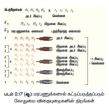 நிறத்தையும் தோற்றுவிக்கின்றன. R மரபணு இல்லாமை வெள்ளை விதையுறையாக உள்ளது.