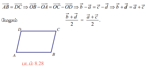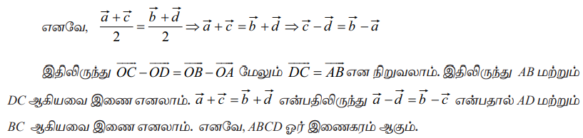 AC, BD ஆகியவற்றை மூலைவிட்டங்களாக கொண்ட நாற்கரத்தின் முனைப்புள்ளிகள் A, B, C, D என்க. O−வை ஆதியாகக் கொண்டு A, B, C மற்றும் D−ன் நிலை வெக்டர்கள்