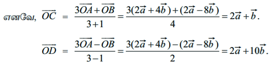 என்க. A மற்றும் B−யை இணைக்கும் கோட்டுத்துண்டினை 1 : 3 என்ற விகிதத்தில் உட்புறமாகவும், வெளிப்புறமாகவும் பிரிக்கும் புள்ளிகளின் நிலை வெக்டர்களைக் காண்க.
