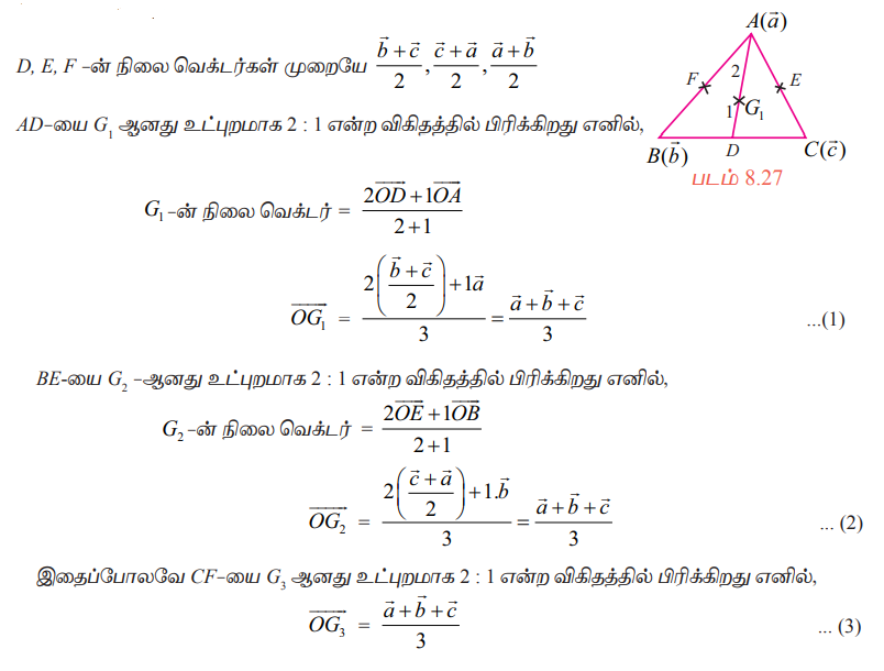 (1), (2), (3)−லிருந்து G1, G2, G3, ஆகியவற்றின் நிலை வெக்டர்கள் சமம். எனவே அவை வெவ்வேறான புள்ளிகள் இல்லை. அந்த பொதுப்புள்ளியை G என்க.