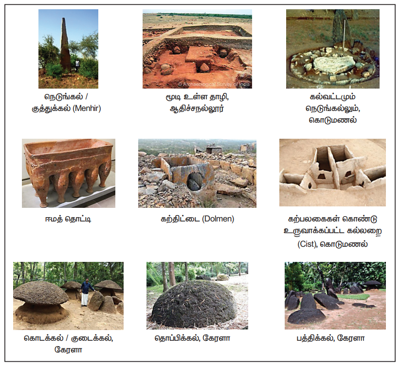 எனப்படும் நினைவுச்சின்ன குத்துக் கல், தாழி, பாறையைக் குடைந்து உருவாக்கிய குகைகள், சார்க்கோபேகஸ்