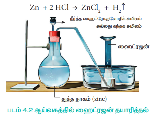 படம் 4.2 ஆய்வகத்தில் ஹைட்ரஜன் தயாரித்தல்