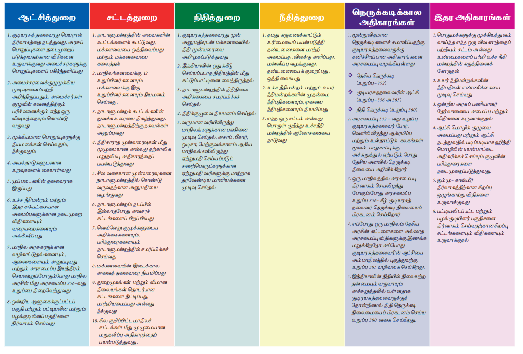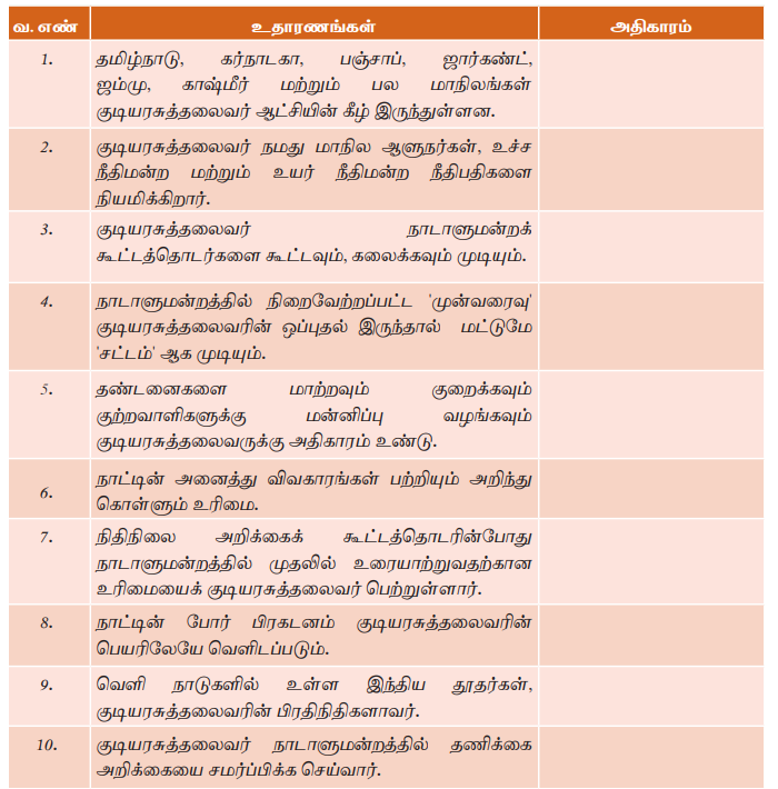 கீழே கொடுக்கப்பட்டுள்ள அட்டவணையில், தரப்பட்டுள்ள எண் வரிசைப்படி குடியரசுத்தலைவரின் அதிகாரங்களை அடையாளம் காண்க: (ஆட்சித்துறை சட்டத்துறை / நீதித்துறை /நிதித்துறை/ நெருக்கடிக்கால அதிகாரங்கள்