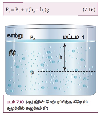 நாம் மட்டம் 1 ஐ நீரின் மேற்பரப்பிலும் அதாவது காற்று நீர் இடைப்பகுதி, மட்டம் 2 ஐ மேற்பரப்பிற்கு கீழே h ஆழத்திலும் (படம் 7.10 (ஆ) இல் காட்டியுள்ளவாறு) தேர்வு செய்தால் h1 மதிப்பு சுழியாகும் (h1 = 0) மற்றும் P1 காற்றழுத்தத்தின் மதிப்பைப் பெறுகிறது Pa மேலும் h ஆழத்தில் அழுத்தம் (P2) ஆனது P என்ற மதிப்பைப் பெறும். இந்த மதிப்புகளை சமன்பாடு (7.16) இல் பிரதியிட
