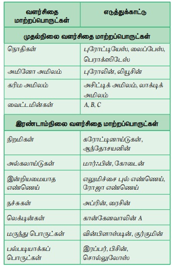 பல கரிம மூலக்கூறுகளை உற்பத்தி செய்கின்றன. இப்பகுதிக்கூறுகள் வளர்சிதைமாற்றப் பொருட்கள் என அழைக்கப்படுகின்றன.