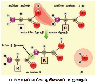நீர் வெளியேற்றப்பட்டு டைபெப்டைடு உருவாகிறது. பல அமினோ அமிலங்கள்