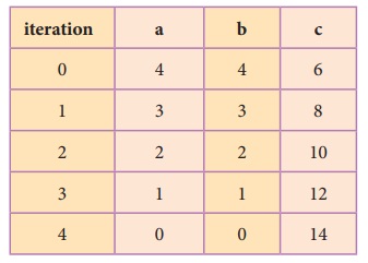 எண்ணிக்கையையும் a,b,c மாறிகளாக எடுத்துக் கொள்வோம். அதனுடைய தொடக்க மதிப்பு முறையே