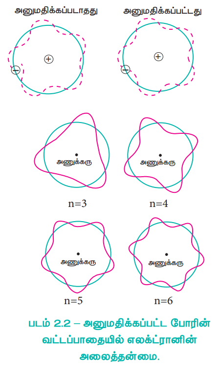 டி பிராக்ளி கொள்கைப்படி, அணுக்கருவினை சுற்றி வரும் எலக்ட்ரானானது, துகள் மற்றும் அலை ஆகிய இரண்டின் பண்புகளையும் பெற்றுள்ளது. எலக்ட்ரான் அலையானது தொடர்ச்சியாக அமைய வேண்டுமெனில், எலக்ட்ரான் சுற்றி வரும் வட்டப்பாதையின் சுற்றளவானது, அதன் அலை நீளத்தின் முழுஎண் மடங்காக இருக்க வேண்டும். அவ்வாறு இல்லாத நிலையில் எலக்ட்ரான் அலையானது தொடர்ச்சியற்றதாக இருக்கும்.