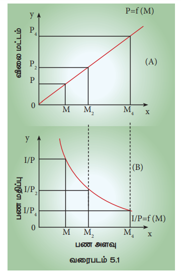 வரைபடம் (A) மொத்த பண அளவில் ஏற்படுத்தப்படும் மாறுதல் விலைமட்டத்தில் எவ்வாறு மாற்றத்தினை ஏற்படுத்துகிறது என்பதனை உணர்த்துகிறது. பண அளவு OM ஆக இருக்கும்பொழுது விலைமட்டம் OPயாக உள்ளது. பிறகு பண அளவினை OM2 என இரட்டிப்பாக்கும் பொழுது விலைமட்டமும் OP2 என இரட்டிப்பாகிறது. மேலும், பண அளவு OM4 என நான்கு மடங்காக்கும் பொழுது விலைமட்டமும் OP4 என நான்கு மடங்காகிறது. விலைமட்டச் சார்பு OP = f(M) க்கான நேர்கோடு வரைபடத்தின் தோற்றுவாயிலிருந்து 45° அமையும்பொழுது பணத்தின் அளவிற்கும் விலைமட்டத்திற்கும் உள்ள நேரடி சமவிகித உறவு விளங்குகிறது.