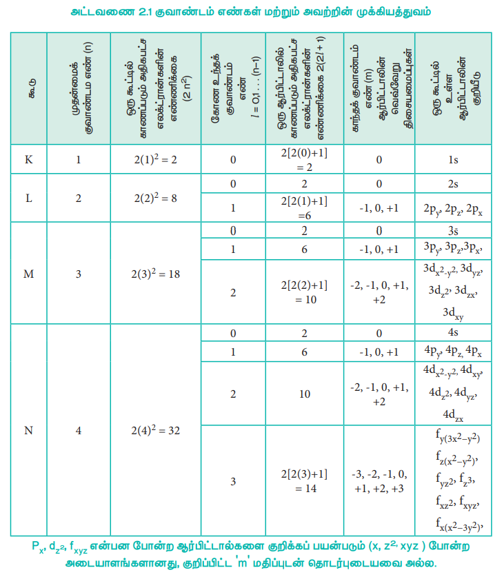 அட்டவணை 2.1 குவாண்டம் எண்கள் மற்றும் அவற்றின் முக்கியத்துவம்