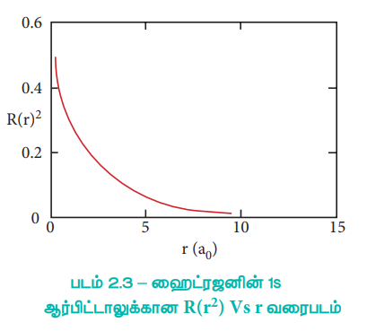 அடிஆற்றல் நிலையில் (ground state) உள்ள ஹைட்ரஜன் அணுவின் ஒற்றை எலக்ட்ரானைக் கருதுக. இந்த எலக்ட்ரானுக்கான குவாண்டம் எண்கள் n = 1 மற்றும் l = 0 அதாவது இந்த எலக்ட்ரான் 1s ஆர்பிட்டாலில் உள்ளது. 1s ஆர்பிட்டாலுக்கான, R (r2) Vs r வரைபடம் படம் (23)ல் கொடுக்கப்பட்டுள்ளது.