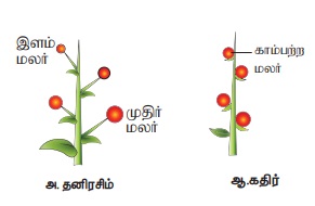 அ. தனி ரசிம்: கிளைக்காத மைய அச்சின் மீது காம்புடைய மலர்கள் அடி முதல் நுனி நோக்கிய வரிசையில் அமைந்திருக்கும்.