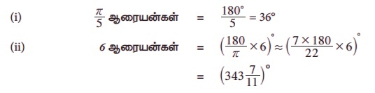 எடுத்துக்காட்டு 3.5 பாகையாக மாற்றுக (i) π/5 ஆரையன்கள் (ii) 6 ஆரையன்கள்.