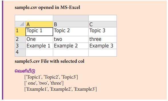 எளிமையாக கூறுவதெனில் CSv.reader மற்றும் CSV.writer ஆனது பட்டியல் (list/tuple) பதிவுடன்