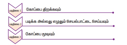 எழுதுவதற்கோ முதலில் கோப்பினை திறக்க வேண்டும். படித்தல் செயல் பாடானது முடிந்த பிறகு