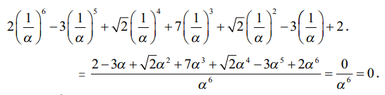 2α6 − 3α5 + √2α4 + 7α3 + √2α2 − 3α + 2 = 0.