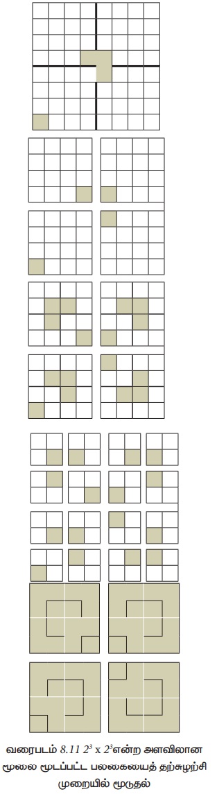 சிக்கலின் அளவு n (2n × 2n) என்ற அளவிலான பலகை. தற்சுழற்சியைப் பயன்படுத்தி நாம் இந்த சிக்கலைத் தீர்க்கலாம். n = 1 என்பது அடிப்படை நிலைமை. இது 2 × 2 அளவிலான மூலை மூடப்பட்ட பலகை. நாம் இதை ஒரு முக்கோண ஓட்டைக் கொண்டு மூடி, சிக்கலைத் தீர்க்கலாம். தற்சுழற்சிப் படியில், 2n × 2n என்ற அளவிலான மூலை மூடப்பட்ட பலகையின் நடுவில் குறுக்காகவும் நெடுக்காகவும் கோடுகளை வரைந்து, அந்தப் பலகையை 4 துணைப்பலகைகளாகப் பிரிக்க வேண்டும். ஒவ்வொரு துணைப்பலகையின் அளவு 2n-1 × 2n-1. வரைபடம் 8.11இல் இடது பக்கப்பலகையில் காட்டப்பட்டுள்ளபடி மூலை மூடப்பட்ட துணைப்பலகையை மூடாதவாறு, ஒரு முக்கோண ஓட்டை முழுப் பலகையின் நடுவில் வைக்கவும். இப்போது ஒவ்வொரு துணைப்பலகையும் 2n-1 × 2n-1 என்ற அளவுகொண்ட மூலை மூடப்பட்ட நான்கு பலகைகளாக உள்ளன.