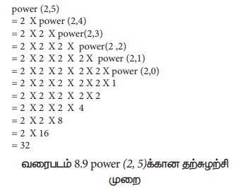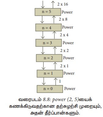 power (a, n) ஐக் கணக்கிடுவதற்கான தற்சுழற்சி முறையும், அதன் தீர்ப்பான்களும் படம் 8.8 இல் காட்டப்பட்டுள்ளன.