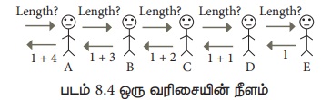 அவர் வரிசையின் நீளத்தைத் தானாகவே கணக்கிடுவதற்குப் பதிலாக, வரிசையில் முதலாவதாக நிற்கின்ற வாடிக்கையாளர் Aயிடம், வரிசையின் நீளம் என்ன? என்று கேட்கிறார். வாடிக்கையாளர் A, வாடிக்கையாளர் B யிடம், நீளம் என்ன? என்று கேட்கிறார். வாடிக்கையாளார் B வாடிக்கையாளர் C யிடம் கேட்கிறார். இப்படி ஒவ்வொருவரும் தனக்குப்பின் இருப்பவரிடம் கேட்கிறார்கள் வரிசையின் கடைசியில் இருக்கும் வாடிக்கையாளர் E என்று வைத்துக்கொள்வோம். அவரிடம் இந்த கேள்வியைக் கேட்கும் போது, அவர் தன்னிடம் கேட்ட D யிடம் "1” என்று பதிலளிக்கிறார். D,"1+1=2” என்று Cக்குப் பதிலளிக்கிறார். C,"1+2=3" என்று நக்குப் பதிலளிக்கிறார். B,"1+3=4” என்று A க்குப் பதிலளிக்கிறார். A,"1+4=5'' என்று தன்னிடம் கேட்ட சேவையாளருக்குப் பதிலளிக்கிறார்.