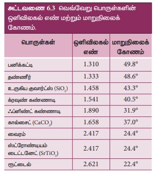 எண்ணைச் சார்ந்துள்ளது. வெவ்வேறு பொருள்களின் ஒளி விலகல் எண் மற்றும் மாறுநிலைக் கோணம்